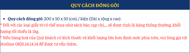 – Một đơn hàng có 01 hoặc nhiều kiện hàng, “Điều kiện áp dụng” được hiểu là khối lượng của tất cả các kiện hàng cộng lại. “Giá trị đơn hàng” được hiểu là giá trị của tất cả các kiện hàng cộng gộp lại.