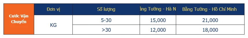 Nếu quý khách cần tối ưu cước vận chuyển hơn, có thể yêu cầu sử dụng tàu chậm 72h (HN -HCM). Khi đó: CƯỚC (Bằng Tường. – HCM) = Cước (Bằng Tường – Hà Nội) + (2.000 đ/kg và 500.000 đ/m3)