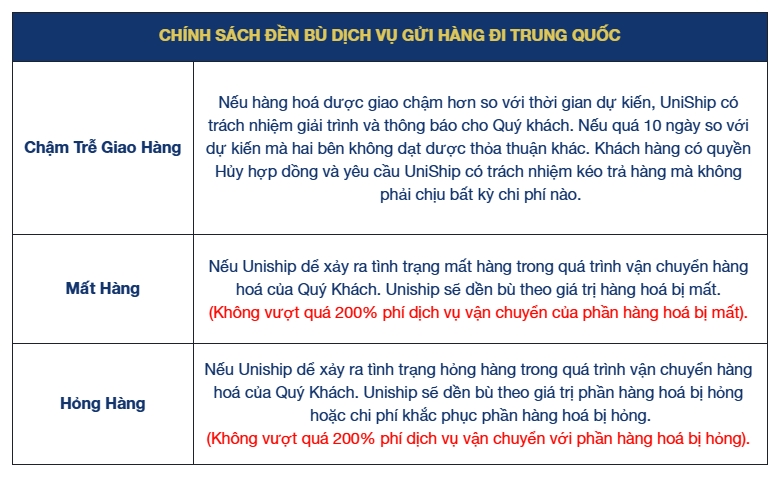 Chính sách đền bù của Uniship Logistics khi khách hàng sử dụng dịch vụ “gửi hàng đi Trung Quốc“