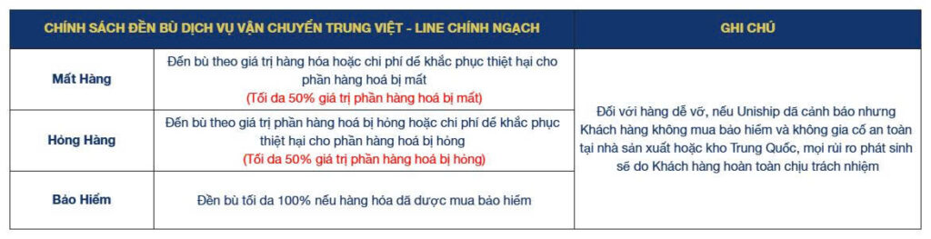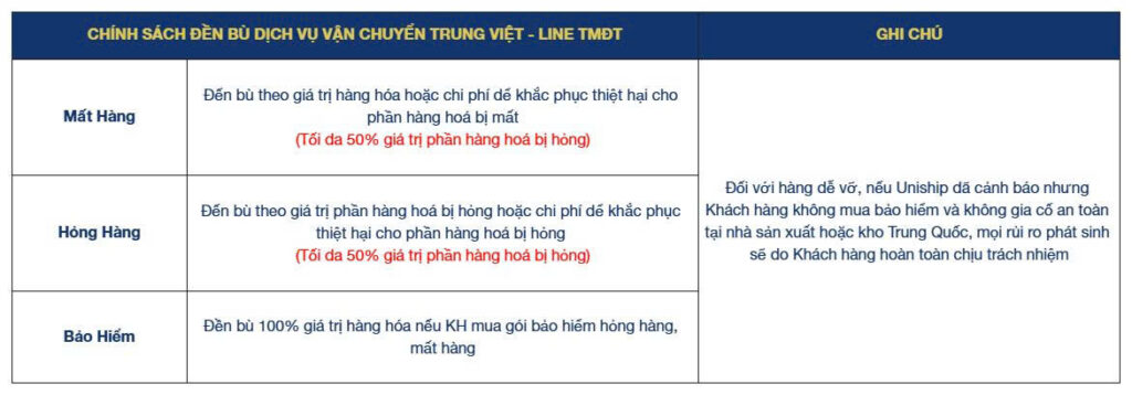 3. Chính sách đền bù dịch vụ vận chuyển Trung – Việt line Chính Ngạch